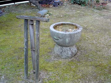 庭に石臼と手水鉢があります、野鳥が水浴びに来るので水を欠かせません。