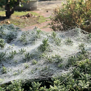 岡崎市東公園、幻想的です 自宅の庭 霧の水滴がクモの巣について輝いています
